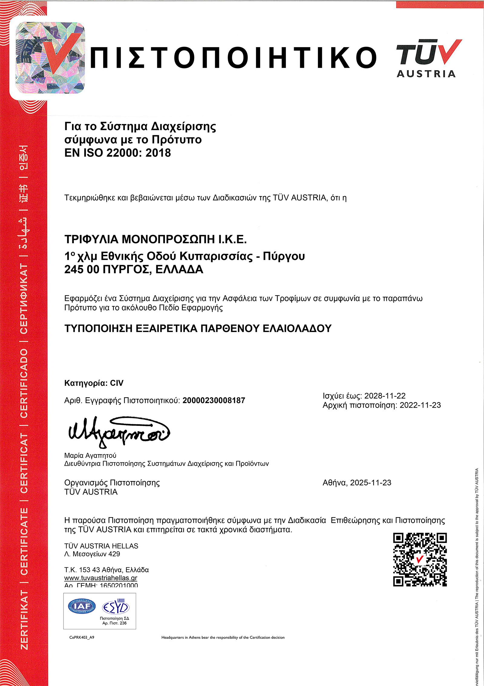 Διεθνή Βραβεία & Πιστοποίηση Η εταιρία μας Trifilia βραβεύτηκε με ασημένιο μετάλλιο στον Διεθνή Διαγωνισμό Ελαιόλαδου Athena το 2020, αναγνωρίζοντάς της επίσημα ότι διαθέτει ένα από τα καλύτερα ελαιόλαδα σε έναν τομέα διεθνώς διαγωνιζομένων. Αυτός ήταν ο πρώτος διαγωνισμός που συμμετείχε η Trifilia που κάνει το μετάλλιο ιδιαίτερα ανταποδοτικό. Τα βραβεία από σημαντικούς διεθνής διαγωνισμούς πιστοποιούν την ανώτερη ποιότητα του εξαιρετικού ελαιολάδου μας και μας γεμίζουν ικανοποίηση για την αναγνώριση της ακούραστης προσπάθειάς μας να προσφέρουμε μόνο τα καλύτερα προϊόντα . |